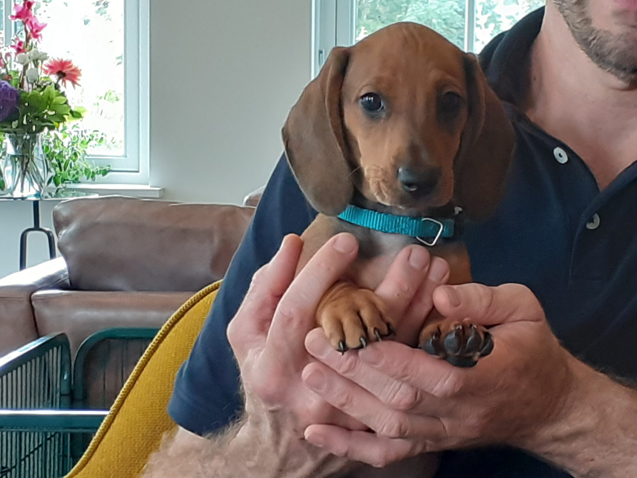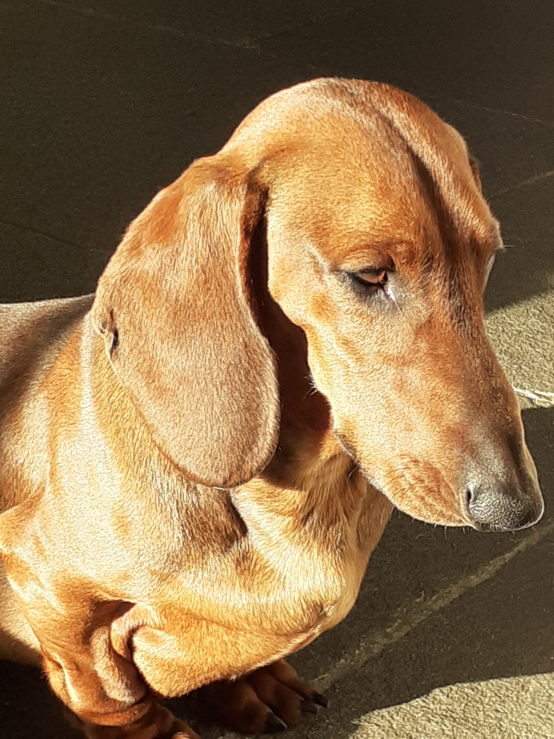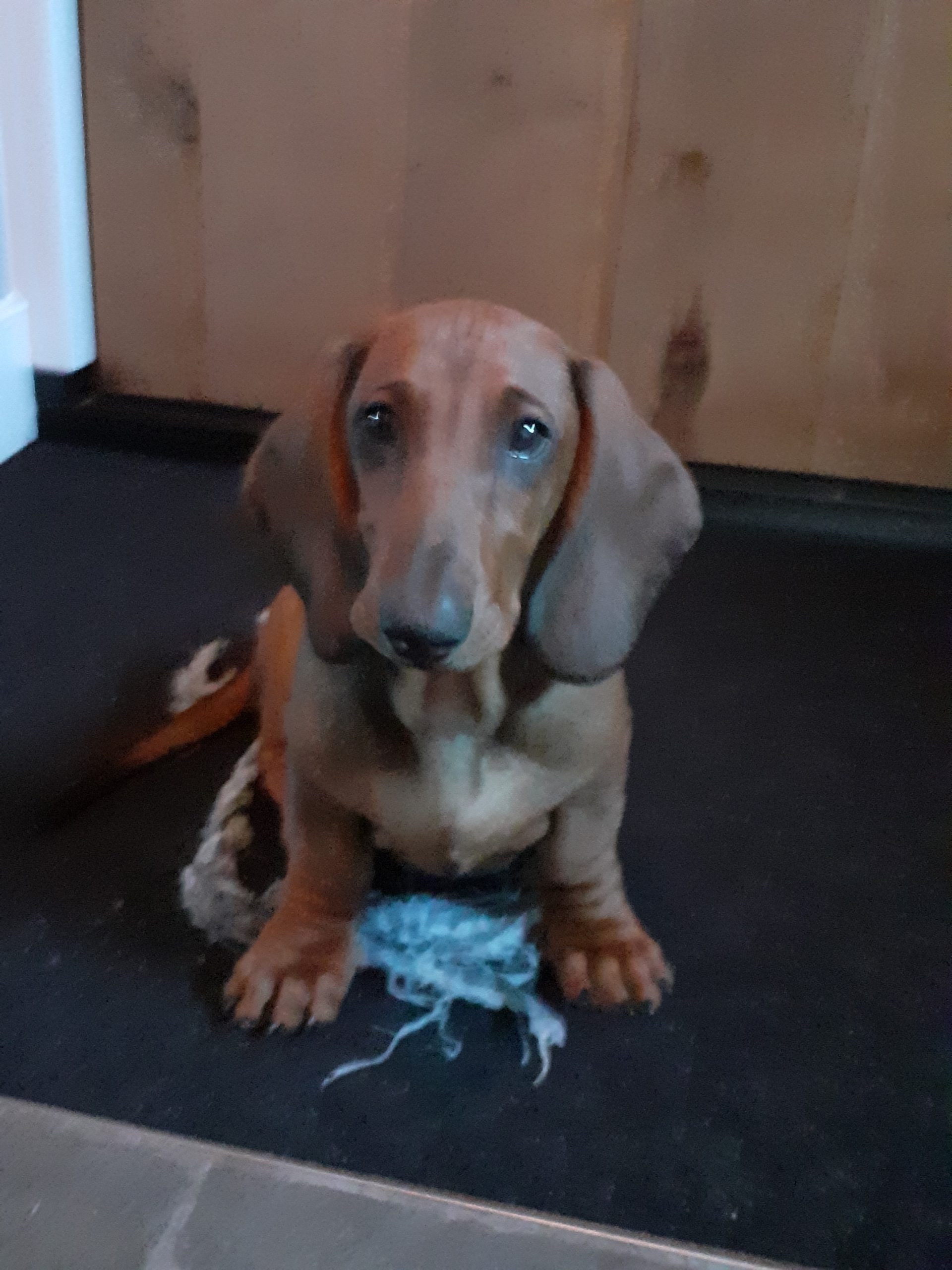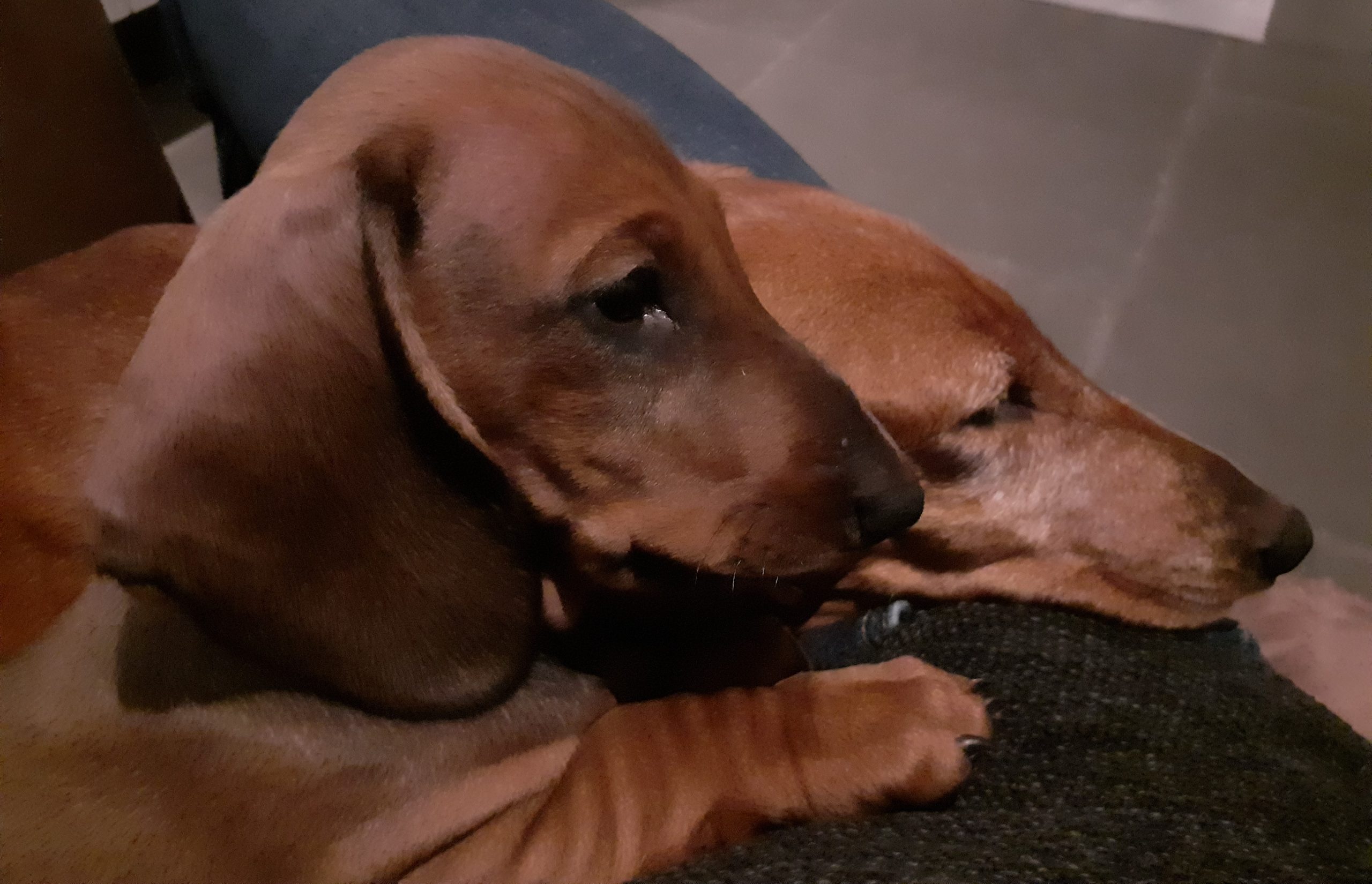 Twirre is een zelfstandige teckel. In huis is ze rustig en ligt het liefst op schoot of op de bank zodat ze wel alles kan overzien. Buiten heeft ze de pas er aardig in. Ze heeft duidelijk voorkeur voor bepaalde personen, degene die ze niet interessant vindt laat ze aan haar voorbij gaan. Twirre heeft 2 nesten gehad. Haar eerste nest was erg groot met 9 pups. Ze gaf ruim voldoende voeding dus heeft alle 9 pups zonder enige hulp groot gebracht. In het tweede nest zaten 6 pups. Van het laatste nest hebben we Fien gehouden. Twirre is inmiddels gesteriliseerd.
