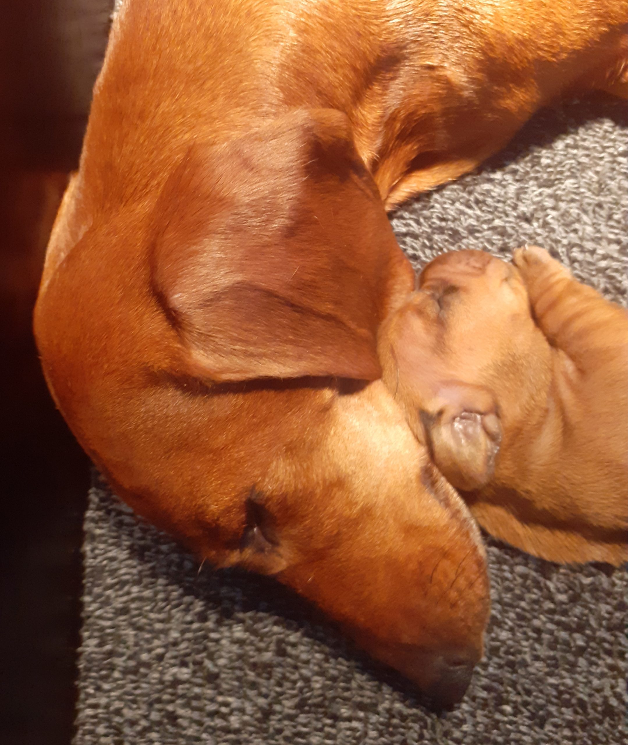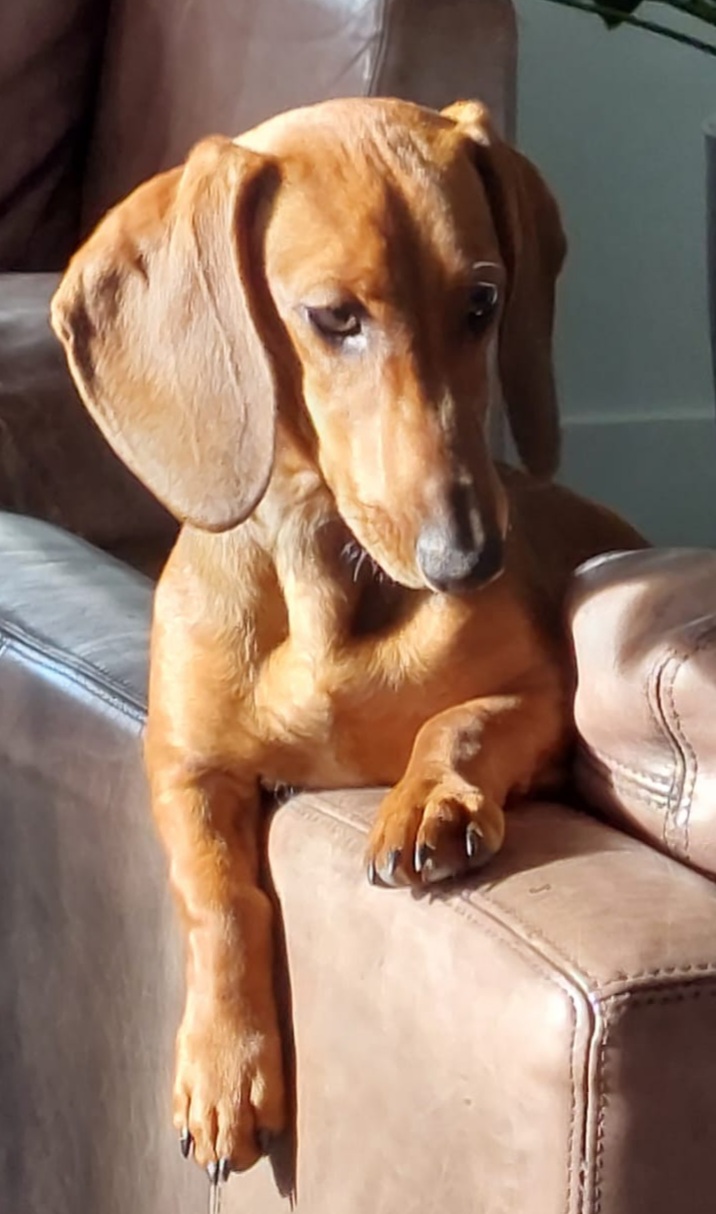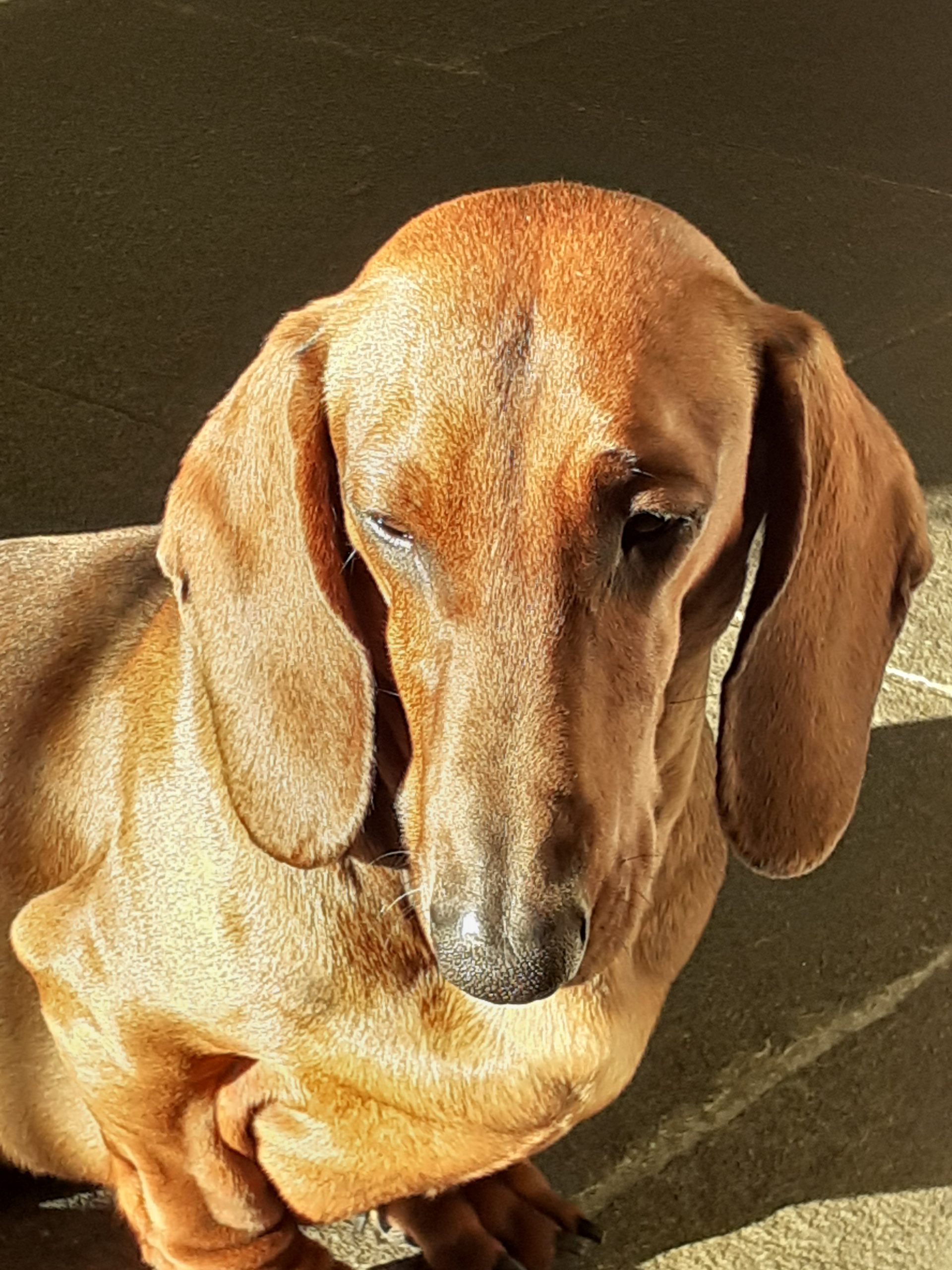Twirre is een zelfstandige teckel. In huis is ze rustig en ligt het liefst op schoot of op de bank zodat ze wel alles kan overzien. Buiten heeft ze de pas er aardig in. Ze heeft duidelijk voorkeur voor bepaalde personen, degene die ze niet interessant vindt laat ze aan haar voorbij gaan. Twirre heeft 2 nesten gehad. Haar eerste nest was erg groot met 9 pups. Ze gaf ruim voldoende voeding dus heeft alle 9 pups zonder enige hulp groot gebracht. In het tweede nest zaten 6 pups. Van het laatste nest hebben we Fien gehouden. Twirre is inmiddels gesteriliseerd.